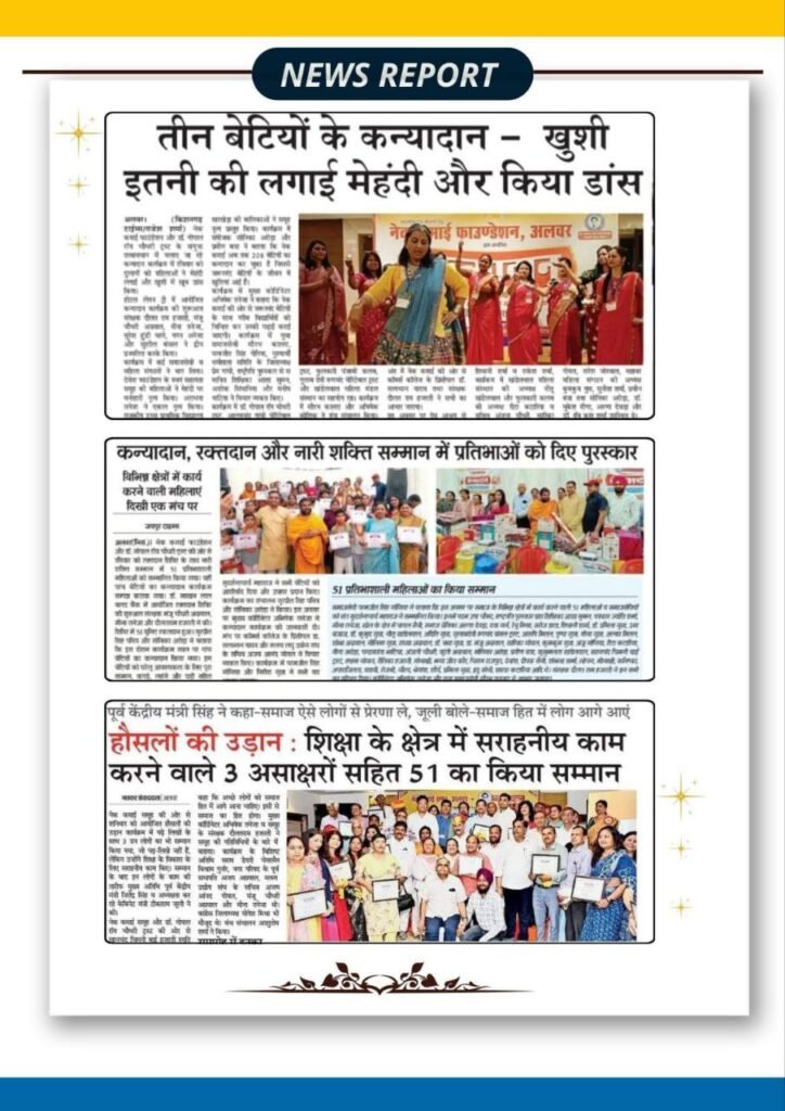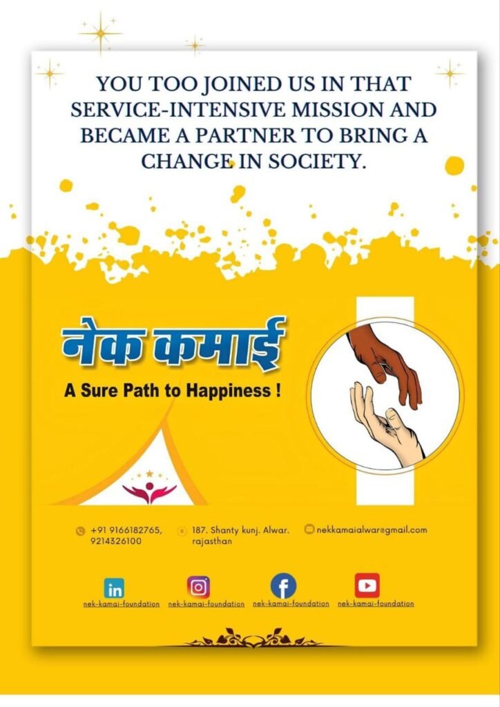 Nek Kamai Foundation, based in Alwar, Rajasthan, has earned a remarkable reputation for its social service and awareness initiatives. Established in 2020 by a group of socially conscious individuals, the foundation’s mission has always been to support the underprivileged and bring meaningful change to their lives. The foundation began its journey during the COVID-19 pandemic in 2020 by distributing ration kits to needy families and extending support to domestic workers. This initial effort marked the foundation’s unwavering commitment to helping the weaker sections of society. In 2022, Nek Kamai Foundation launched an innovative program to identify daughters of poor families and domestic workers, equipping them with skills to make them self-reliant. The foundation provided training in sewing and other livelihood skills, empowering these young women to become independent. It also took the responsibility of arranging marriages for 235 such girls, supporting them financially and emotionally. This initiative stands as one of the foundation’s most significant achievements. Nek Kamai Foundation has become synonymous with service and community welfare. It has undertaken numerous impactful initiatives in Alwar district, including: – Organizing marriages for underprivileged daughters. – Training women to produce goods like jute, paper, and clay products and helping them access markets. – Providing essential resources to improve infrastructure in government schools. – Distributing clothes and gifts to children in Anganwadi centers. – Providing warm clothes in winter and cold water and beverages during summer. To bring lasting change to society, the foundation started evening classes under the name Sanskar Shiksha Vriksh for children in slum areas. These classes aim to instill discipline and moral values, transforming the lives of these children and paving the way for a brighter future. The foundation has organized medical and blood donation camps to address healthcare needs. It has also focused on environmental conservation by planting 5,100 trees and distributing free cloth bags to promote eco-friendly practices. The foundation is dedicated to bringing positive and lasting changes to every section of society. Through its wide-ranging efforts, Nek Kamai Foundation has set an inspiring example of selfless service and empowerment. In this way, Nek Kamai Foundation continues to serve with dedication, creating a significant impact on society while spreading hope and positivity.History of Nek Kamai Foundation Nek Kamai Foundation, based in Alwar, Rajasthan, has earned a remarkable reputation for its social service and awareness initiatives. Established in 2020 by a group of socially conscious individuals, the foundation’s mission has always been to support the underprivileged and bring meaningful change to their lives. The foundation began its journey during the COVID-19 pandemic in 2020 by distributing ration kits to needy families and extending support to domestic workers. This initial effort marked the foundation’s unwavering commitment to helping the weaker sections of society. In 2022, Nek Kamai Foundation launched an innovative program to identify daughters of poor families and domestic workers, equipping them with skills to make them self-reliant. The foundation provided training in sewing and other livelihood skills, empowering these young women to become independent. It also took the responsibility of arranging marriages for 235 such girls, supporting them financially and emotionally. This initiative stands as one of the foundation’s most significant achievements. Nek Kamai Foundation has become synonymous with service and community welfare. It has undertaken numerous impactful initiatives in Alwar district, including: – Organizing marriages for underprivileged daughters. – Training women to produce goods like jute, paper, and clay products and helping them access markets. – Providing essential resources to improve infrastructure in government schools. – Distributing clothes and gifts to children in Anganwadi centers. – Providing warm clothes in winter and cold water and beverages during summer. To bring lasting change to society, the foundation started evening classes under the name Sanskar Shiksha Vriksh for children in slum areas. These classes aim to instill discipline and moral values, transforming the lives of these children and paving the way for a brighter future. The foundation has organized medical and blood donation camps to address healthcare needs. It has also focused on environmental conservation by planting 5,100 trees and distributing free cloth bags to promote eco-friendly practices. The foundation is dedicated to bringing positive and lasting changes to every section of society. Through its wide-ranging efforts, Nek Kamai Foundation has set an inspiring example of selfless service and empowerment. In this way, Nek Kamai Foundation continues to serve with dedication, creating a significant impact on society while spreading hope and positivitive